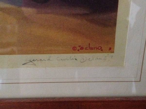 The print image itself is 10-3/4" high by 13-3/4" wide, still in the original 1950's-era framing and glass, with an outer dimension of 15-1/2" by 18-1/2". You can sometimes find copies of the same print for sale on eBay for as much as $250, but many of them have been remounted with a non-original mat and frame, and most are not autographed by the artist like this one.